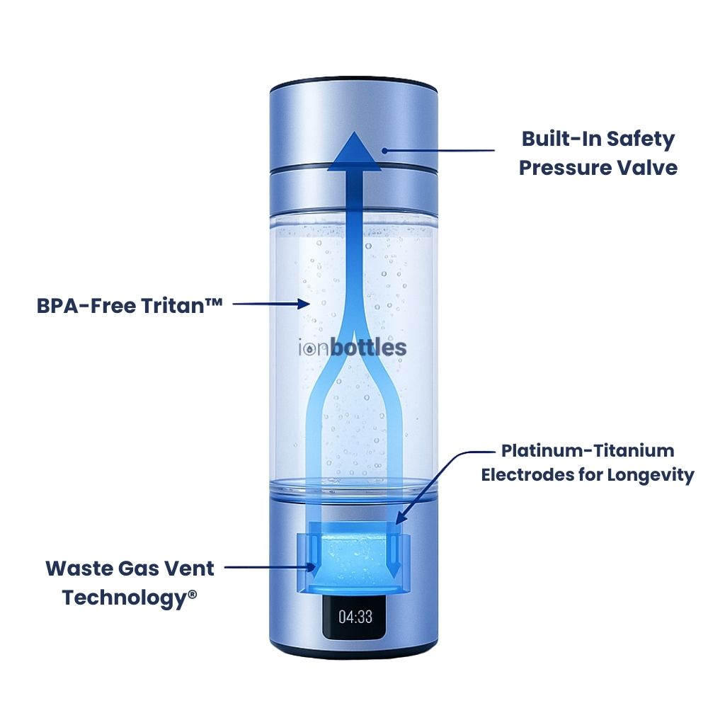 IonBottles uses advanced electrolysis technology to infuse water with hydrogen gas efficiently. Each bottle is designed to operate under optimal conditions to maximize hydrogen concentration. Our products are independently verified by the International Hydrogen Standards Association (IHSA) to exceed industry standards for safety and hydrogen concentration.
